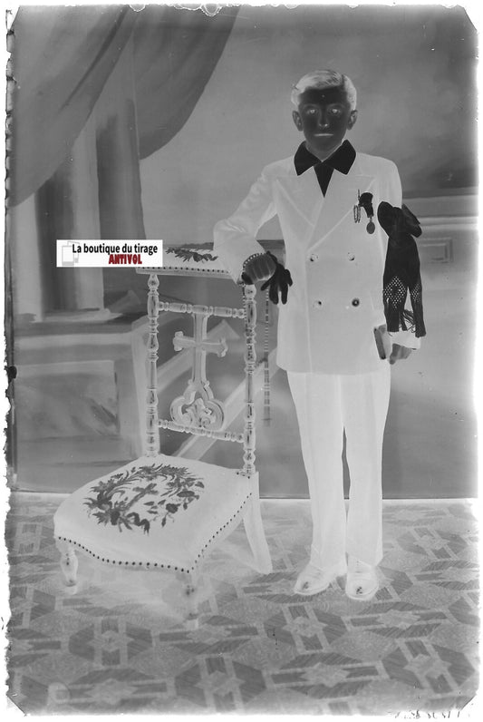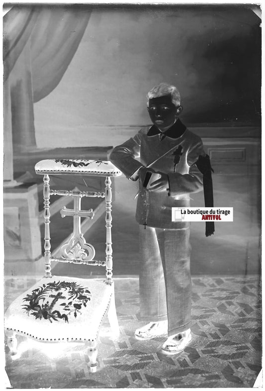 Communion, garçon, Plaque verre photo, négatif noir & blanc 10x15 cm France