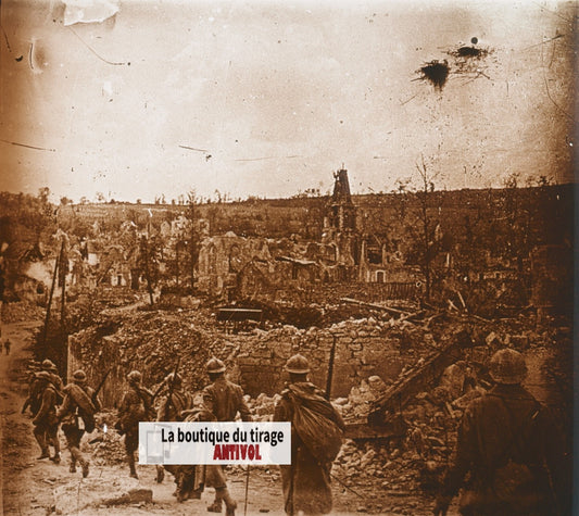 Craonnelle, ruines soldats, WW1, plaque verre, photo ancienne stéréo 6x13 cm