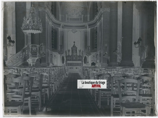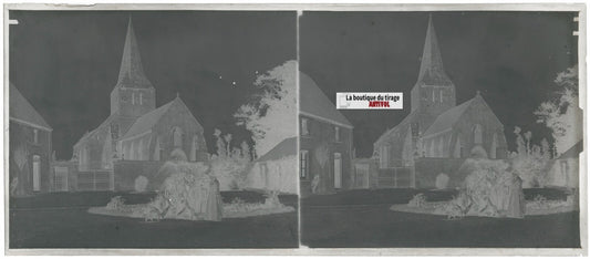Eglise, France, Plaque verre photo ancienne, stéréo négatif noir & blanc 9x18 cm