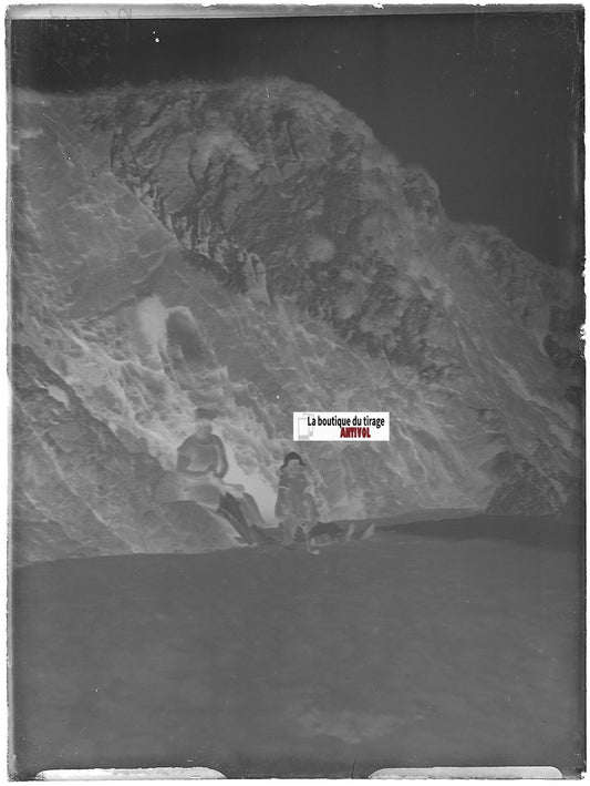 Famille, océan rocher, Plaque verre photo ancienne, négatif noir & blanc 9x12 cm
