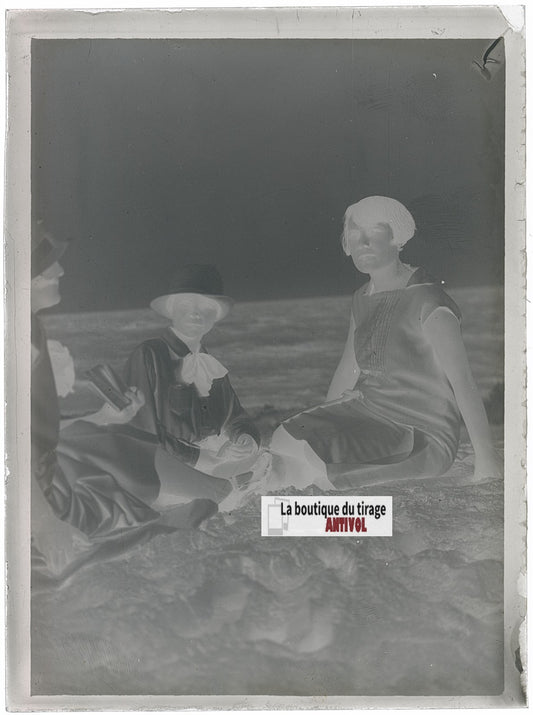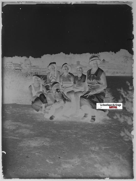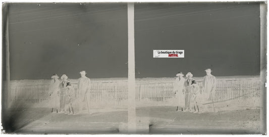 Famille, mer plage, photo ancienne plaque verre, négatif noir & blanc, 9x12 cm