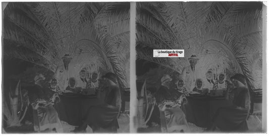 Famille, mer, palmier, stéréoscopie plaque ancienne verre, négatif 9x18 cm