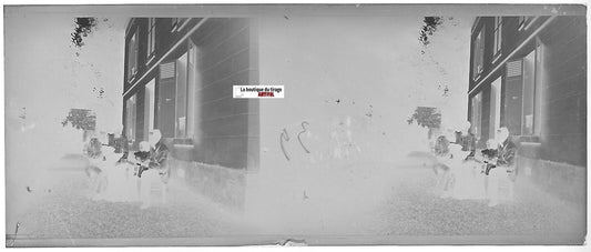 Famille, maison, Plaque verre photo stéréo, négatif noir & blanc 4,5x10,7 cm