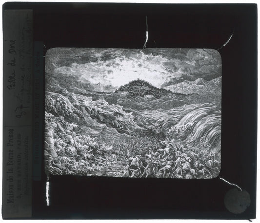 Armée mer Rouge, Bible de Doré, dessin, plaque verre, positif 8,5x10 cm