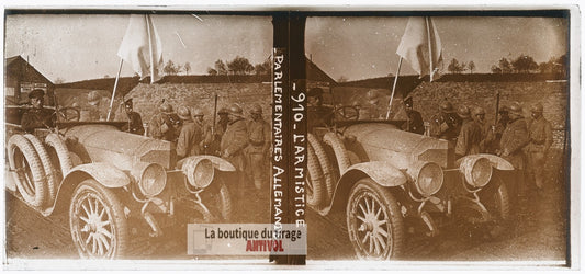 Armistice, parlementaires allemands, plaque verre photo ancienne stéréo 6x13 cm