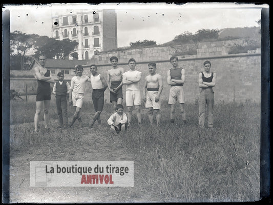 Groupe de sportifs, Oran, Algérie, plaque verre, photo ancienne, négatif 9x12 cm