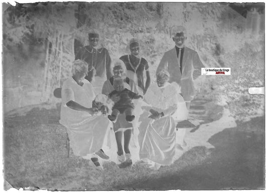 Groupe famille, Plaque verre photo ancienne, négatif noir & blanc 9x12 cm