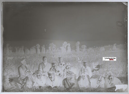 Groupe, paysage, Plaque verre photo ancienne, négatif noir & blanc 13x18 cm