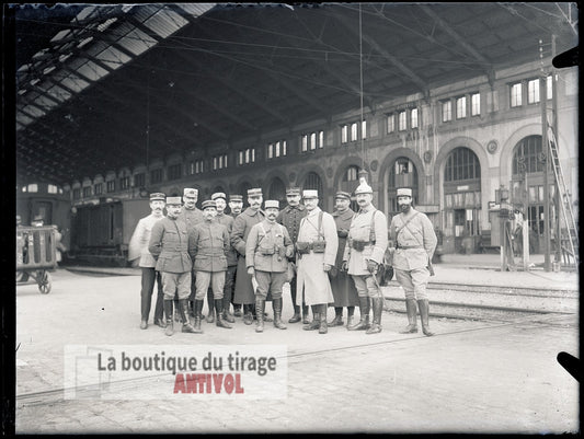 Groupe d’officiers, gare, plaque verre, photo ancienne, négatif 9x12 cm