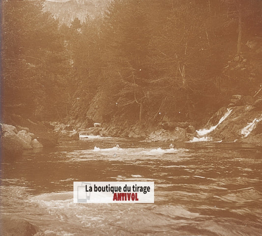 Baignade Rio Cinqueta, plaque verre, photo ancienne stéréo, sépia 6x13 cm
