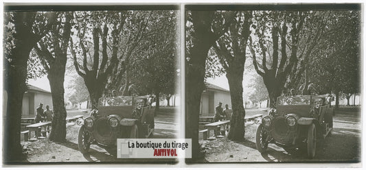 Automobile d’officiers, guerre WW1, plaque verre photo ancienne stéréo 6x13 cm