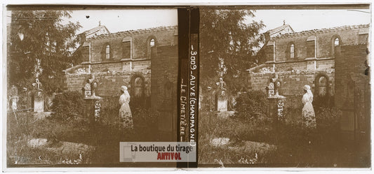 Auve, cimetière, guerre WW1, plaque verre photo ancienne stéréo 6x13 cm