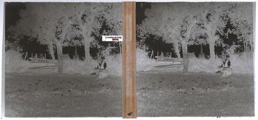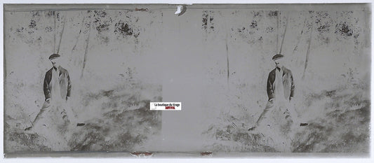 Homme, forêt, Plaque verre photo stéréo, négatif noir & blanc 4,5x10,7 cm