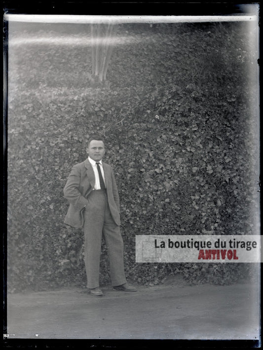Homme, jardin, France, Plaque verre photo ancienne, négatif noir & blanc 9x12 cm