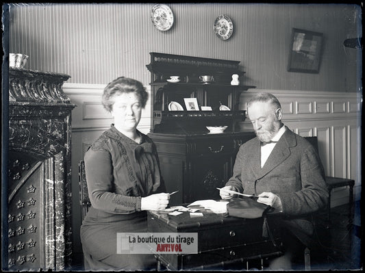Homme, femme, couple, salon, plaque verre, photo ancienne, négatif 9x12 cm