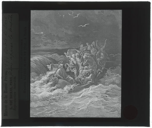 Jésus apaise la tempête, Bible Doré, dessin, plaque verre, positif 8,5x10 cm