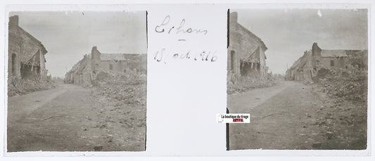 Lihons, ruines WW1, Plaque verre stéréo, positif noir & blanc 4,5x10,7 cm