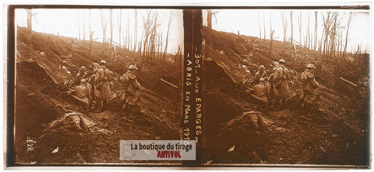 Les Éparges, abris en mars 1915, WW1, plaque verre photo ancienne stéréo 6x13 cm