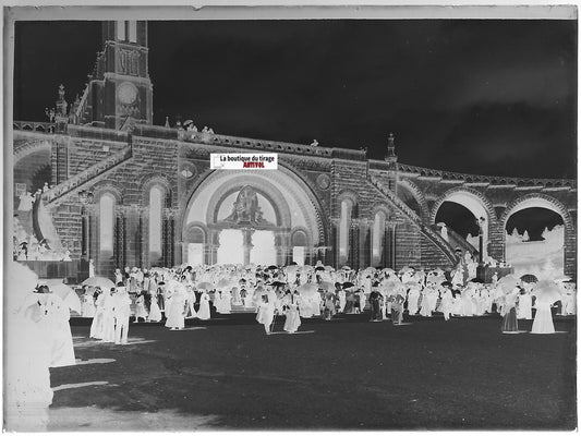 Lourdes, pèlerinage, Plaque verre photo ancienne, négatif noir & blanc 9x12 cm