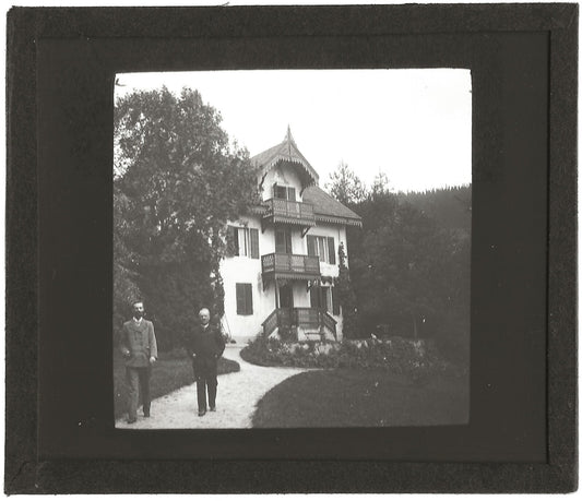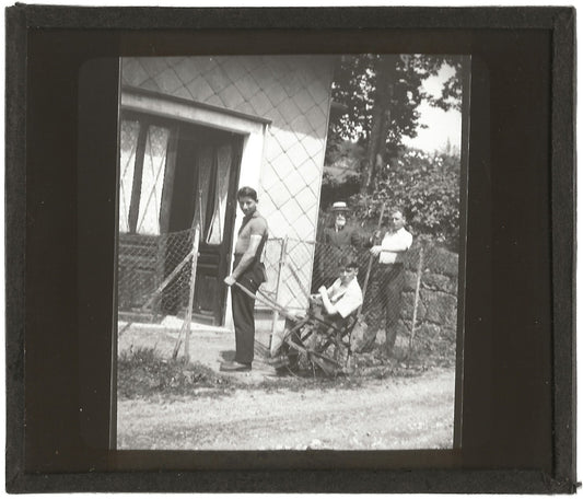 Maison de campagne, hommes, photo plaque de verre, positif 8,5x10 cm