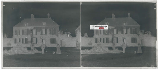 Maison, château, famille, stéréo photo ancienne plaque verre, négatif 8x18 cm