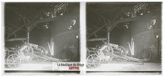 Matériel d’artillerie, canons WW1, plaque verre photo ancienne stéréo 6x13 cm