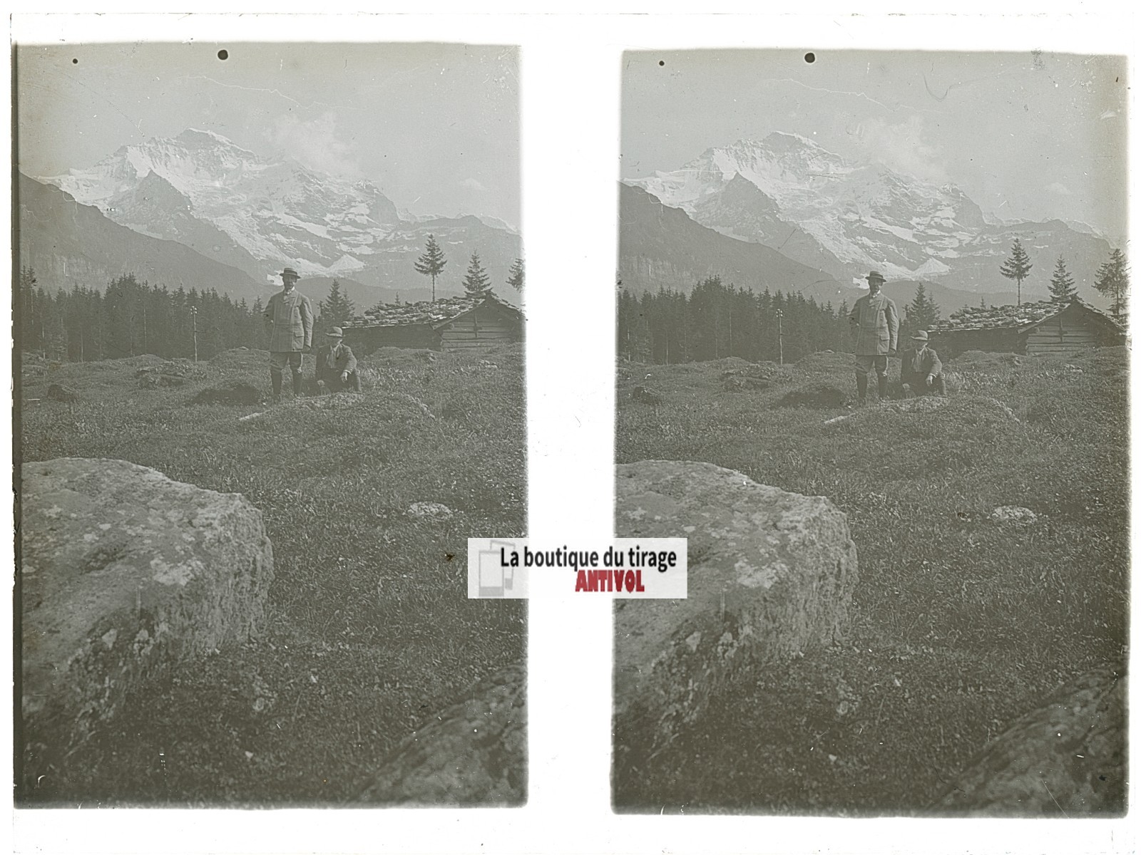 Alpiniste, Alpes Suisse, stéréo photo plaque verre, noir & blanc, 9x12 cm