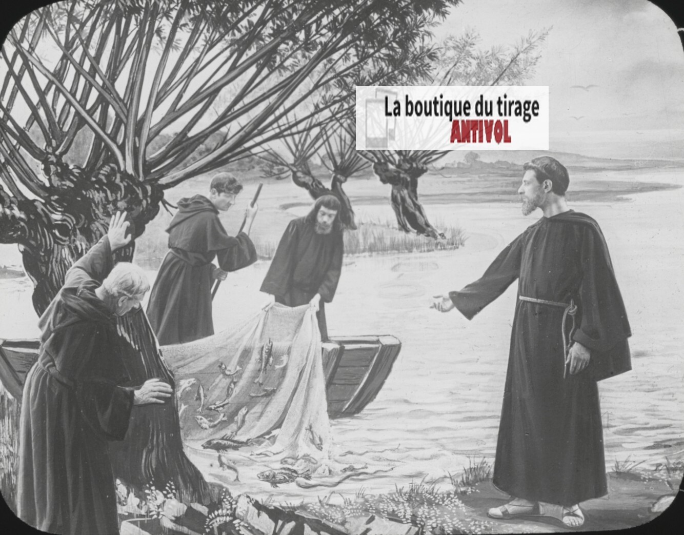 Rare photographie sur plaque de verre montrant le Bureau des Constatations médicales de Lourdes. Autour d’une large table sont réunis ecclésiastiques, médecins et membres du comité, observant et consignant les témoignages de guérisons attribuées aux pèlerinages. À l’arrière-plan, un grand panneau recouvert de portraits et de documents illustre la rigueur de ces investigations, où la foi rencontrait l’examen scientifique. L’atmosphère solennelle, renforcée par la diversité des figures réunies, témoigne de l’importance historique et spirituelle de ce lieu.