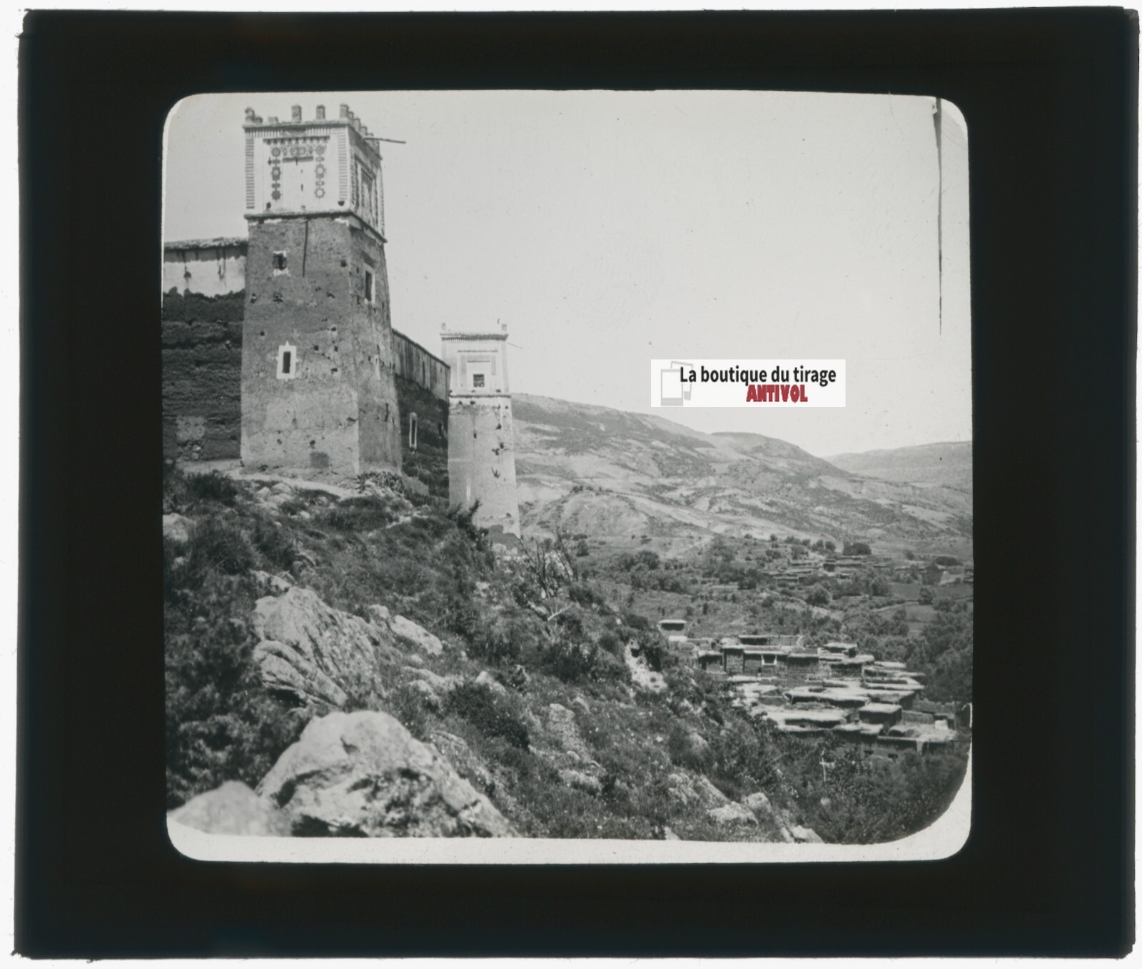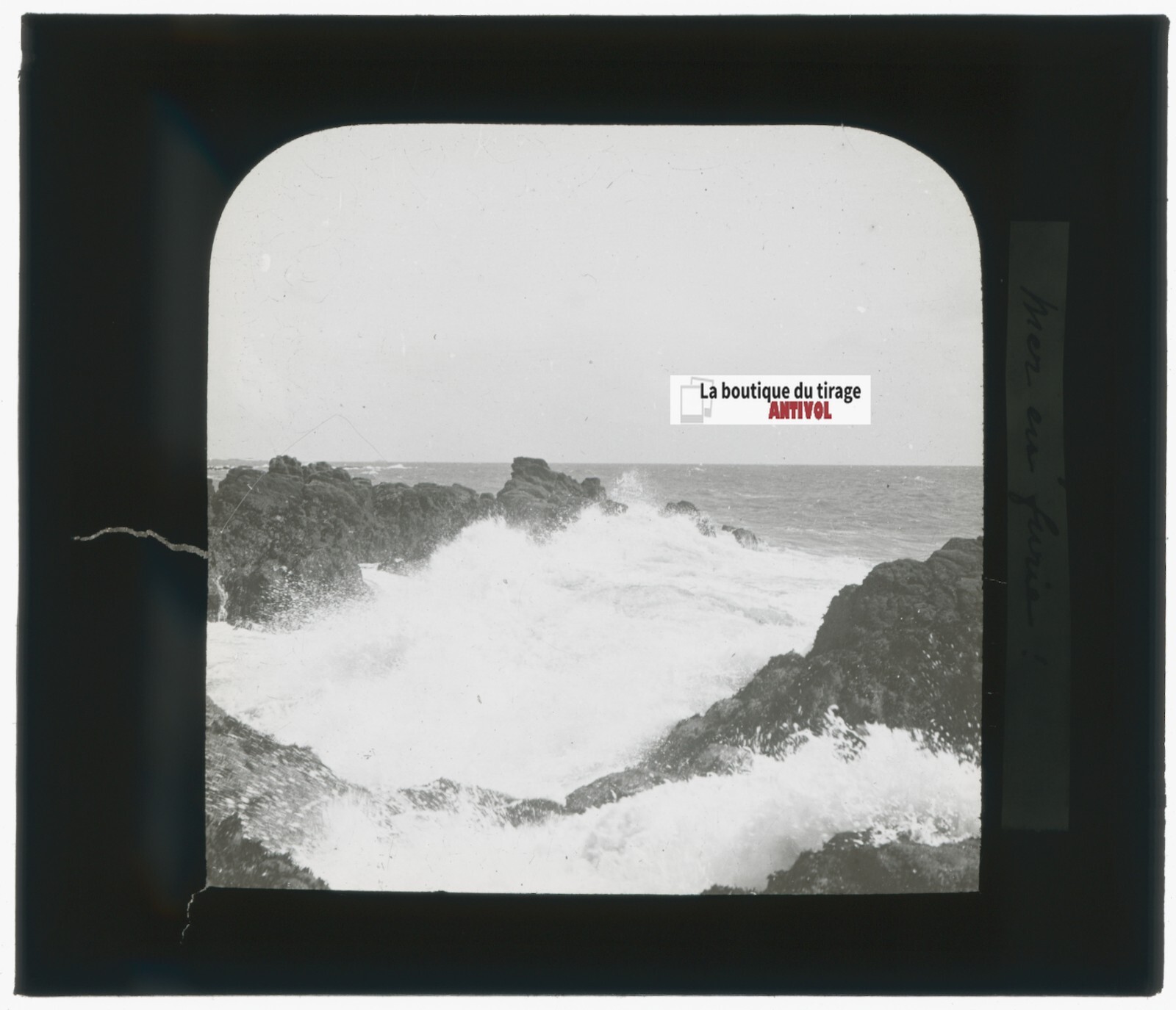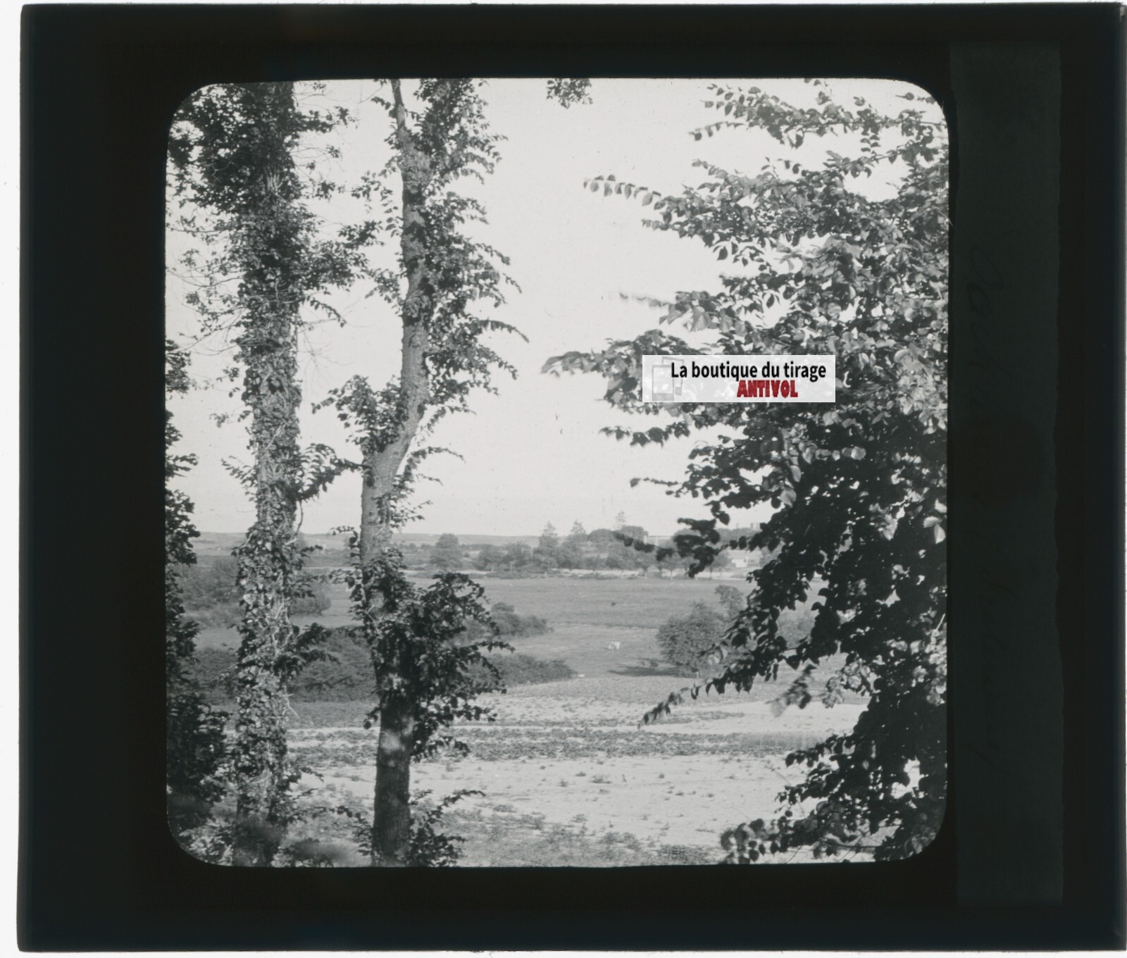 Cette plaque de verre témoigne de l’architecture populaire de Craponne-sur-Arzon (Haute-Loire) vers 1900. On y voit une vieille maison à pans de bois et pierres apparentes, au crépi abîmé, percée de volets de guingois. La bâtisse, marquée par le temps, occupe le centre d’une petite place pavée. Sur la droite, une femme en habits sombres tient par la main une fillette, ajoutant une touche de vie quotidienne à cette scène de village. L’image illustre avec force l’ambiance des bourgs d’Auvergne à la fin du XIXe siècle, entre rusticité et charme d’autrefois.