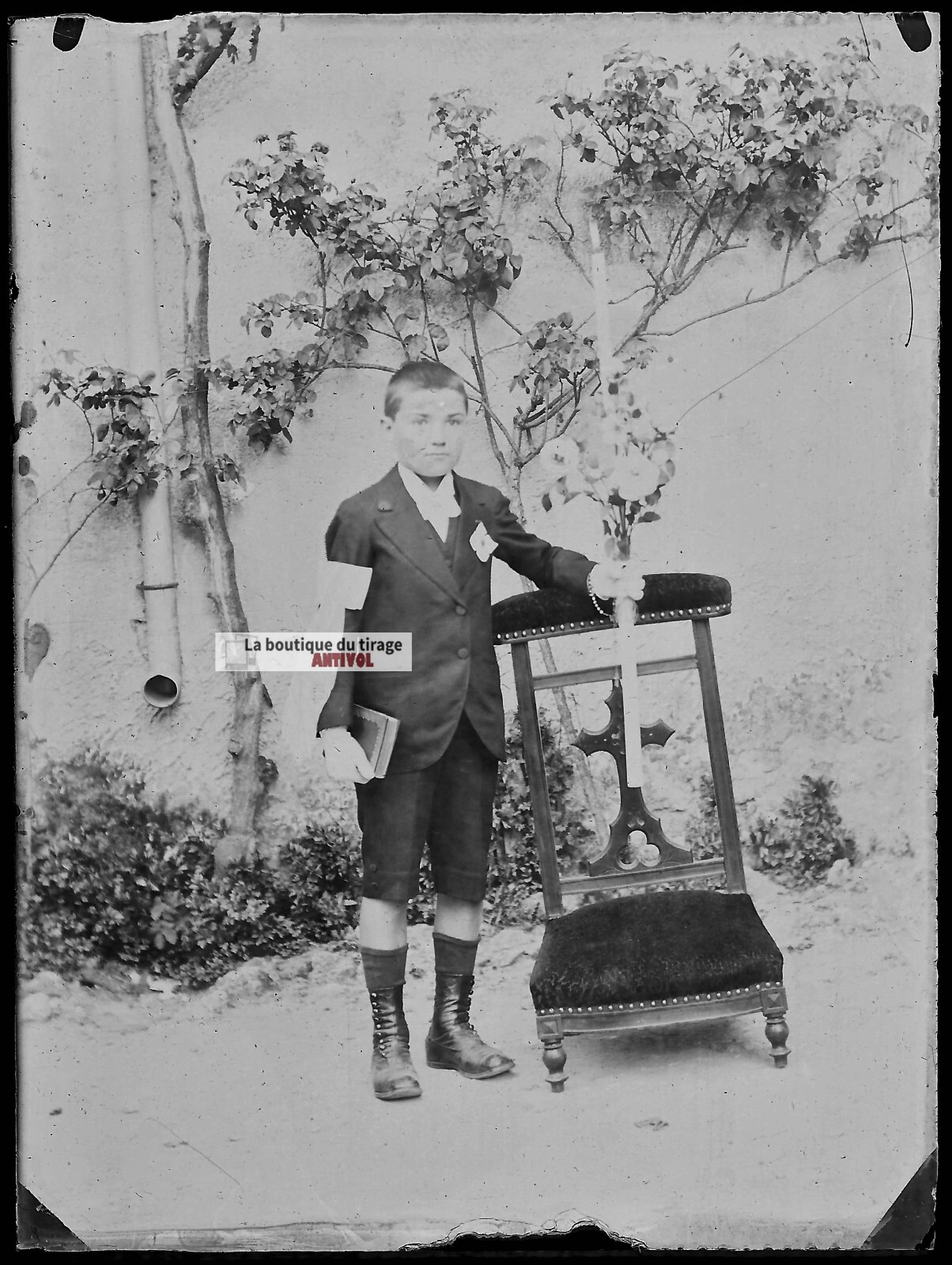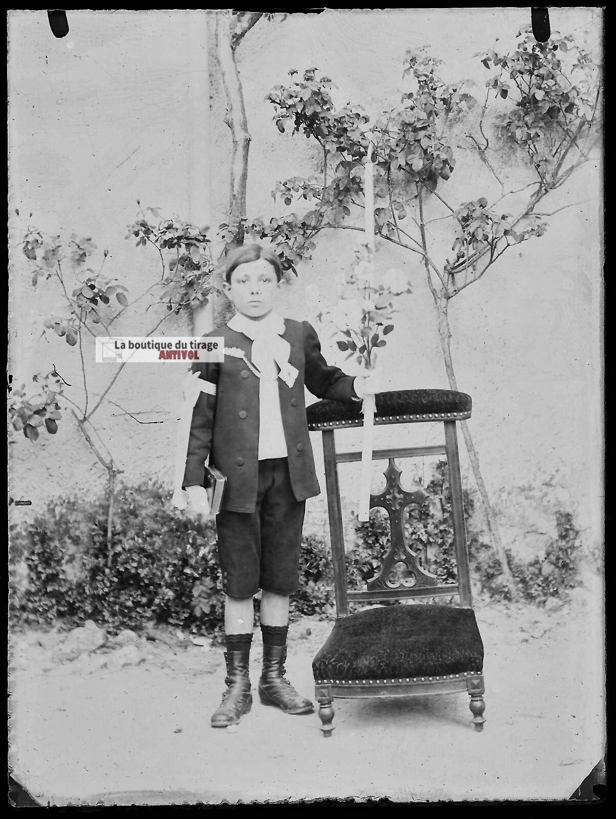 Jeune garçon, vélo, photo ancienne plaque verre, négatif noir & blanc, 9x12 cm
