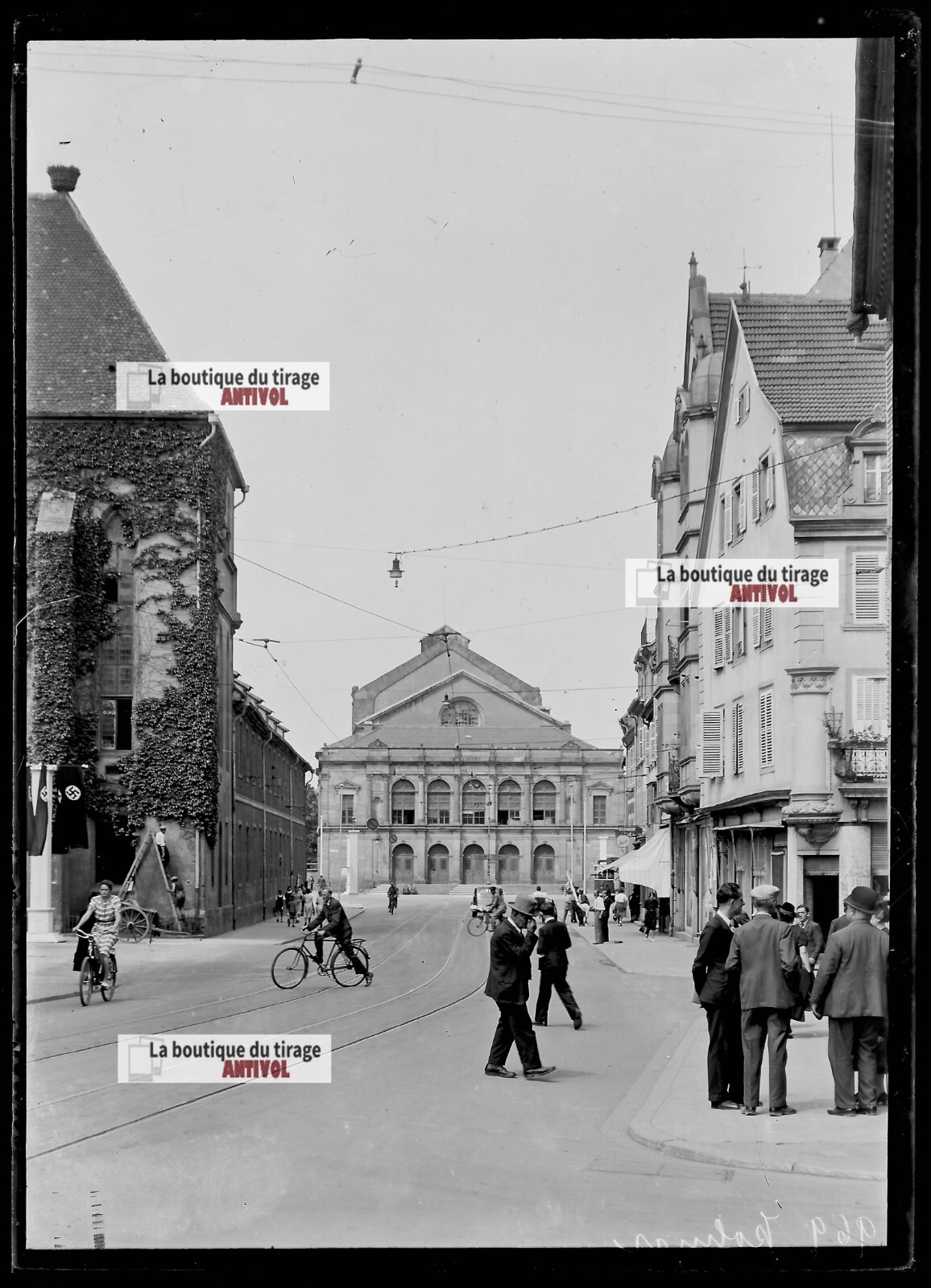 À l’avant, des automobiles des années 1930 stationnent le long du trottoir, témoignant du quotidien d’une époque où la modernité motorisée côtoyait encore les rythmes traditionnels de la cité alsacienne. Les arbres bordant l’avenue encadrent la façade majestueuse, offrant un équilibre entre pierre et verdure.