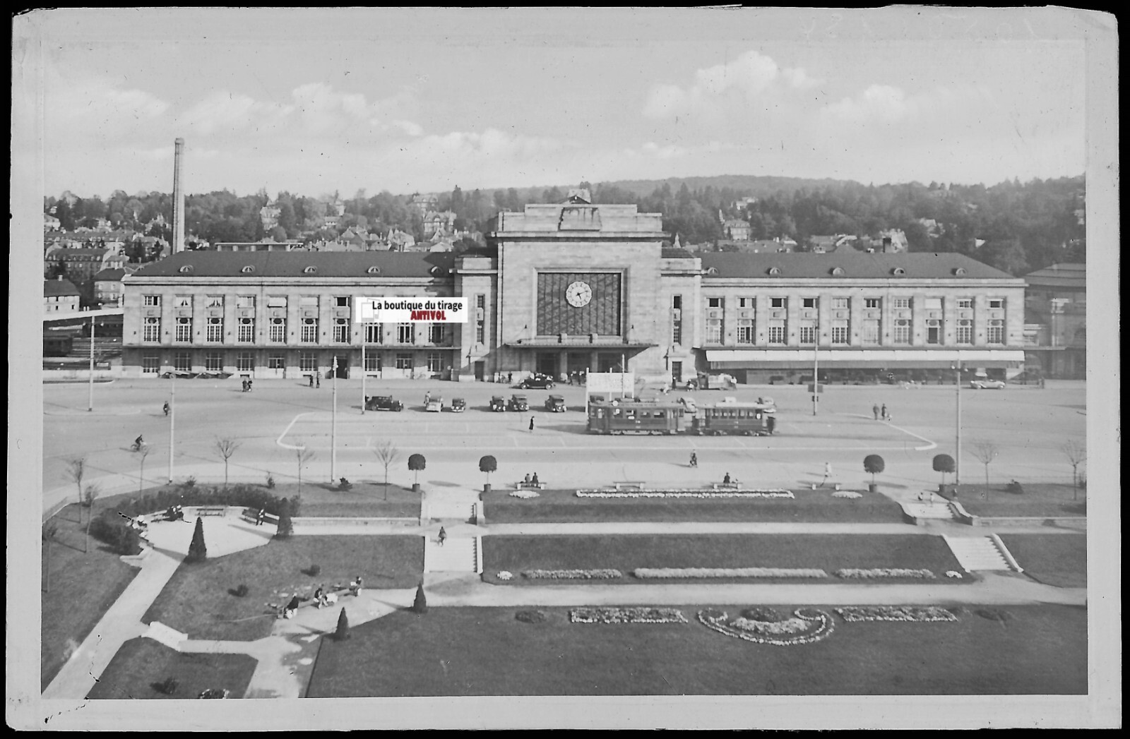 Plaque négative sur verre 9 x 14 cm – Place de la Gare, Sarrebourg (années 1930)