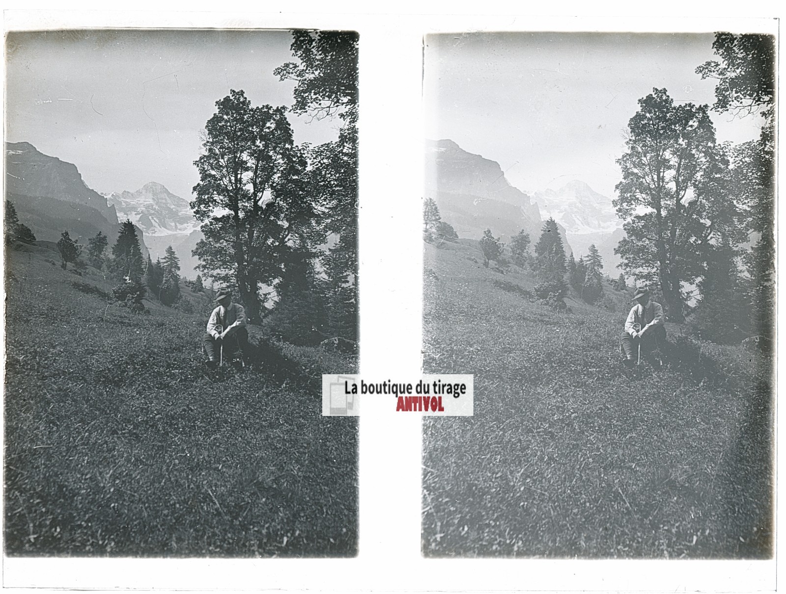 Randonneur, Alpes Suisse, stéréo photo plaque verre, noir & blanc, 9x12 cm