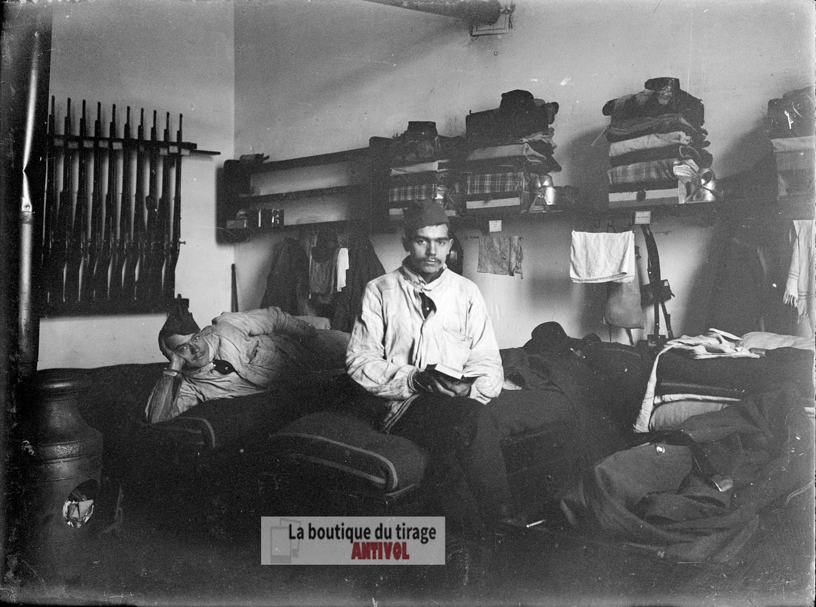 Soldats français en caserne, plaque verre, photo ancienne, négatif N&B 9x12 cm